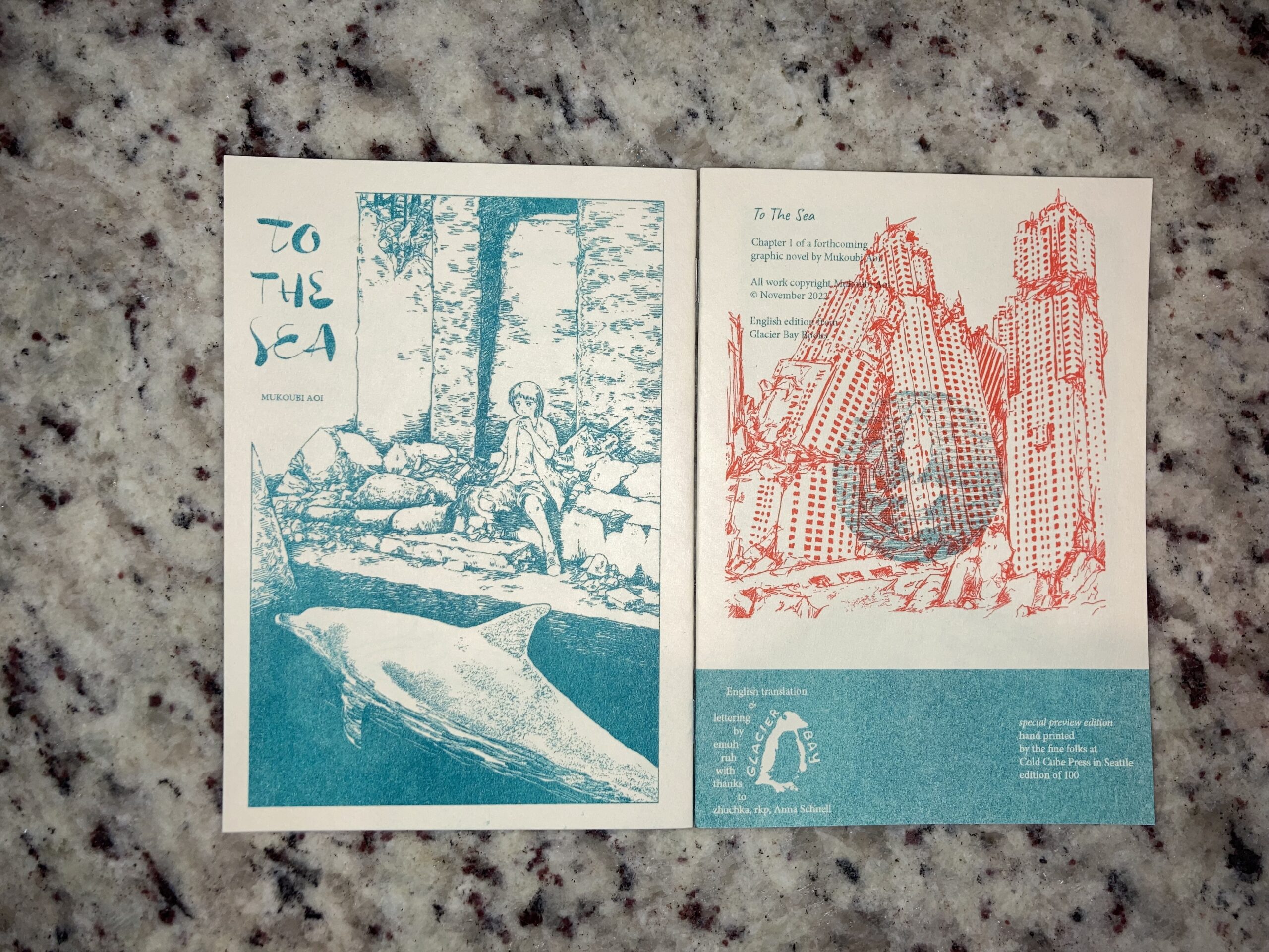 Printed by Cold Cube Riso printers in Seattle, for Short Run 2022 comics art festival. Limited to an edition of 100 copies printed. Available while supplies last. Chapter 1 of a forthcoming graphic novel from Mukoubi Aoi. 12 p minicomic. saddle stitch binding, 1 color riso interior, 2 color riso cover.